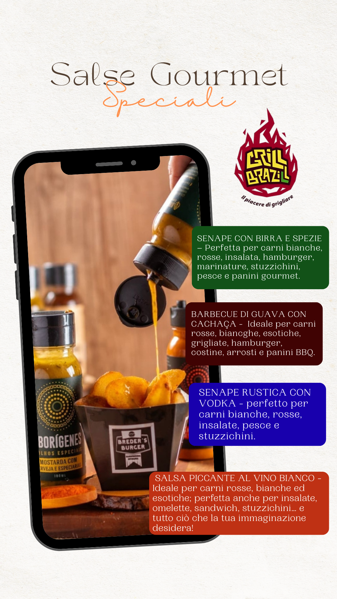 Kit Duo Salse Gourmet – Sapori & Creatività Un’idea regalo elegante, utile e ricca di gusto!Il Kit Duo Salse Gourmet Aborígenes riunisce due condimenti artigianali brasiliani preparati con ingredienti selezionati, perfetti per arricchire carni, panini, insalate, aperitivi e ricette creative. Il formato ideale per chi vuole scoprire i nostri sapori speciali o per chi desidera fare un regalo gourmet originale e sorprendente. SCEGLI LE TUE 2 SALSE PREFERITE 🍺 Senape con Birra & Spezie Un equilibrio tra intensità e aromaticità: senape gialla, birra lager e spezie con un tocco di curry e pepe nero.Perfetta con: carni bianche e rosse, hamburger, marinature e panini gourmet. 🔥 Barbecue di Guava con Cachaça Dolcezza e affumicato si fondono in una salsa tipicamente brasiliana a base di goyaba e cachaça invecchiata.Ideale per: grigliate, costine, arrosti, carni rosse e panini BBQ. 🍸 Senape Rustica alla Vodka Audace e sorprendente: senape marrone, vodka e spezie affumicate.Perfetta per: carni bianche, rosse, insalate, pesce e aperitivi. 🌶️ Peperoncino al Vino Bianco Piccantezza elegante: peperoncino dedo de moça, vino bianco e spezie selezionate.Ottima per: frutti di mare, insalate, omelette, sandwich e piatti esotici. 🎁 **Un duo gourmet per dare personalità a ogni ricetta. Perfetto come regalo o per scoprire nuovi sapori!**